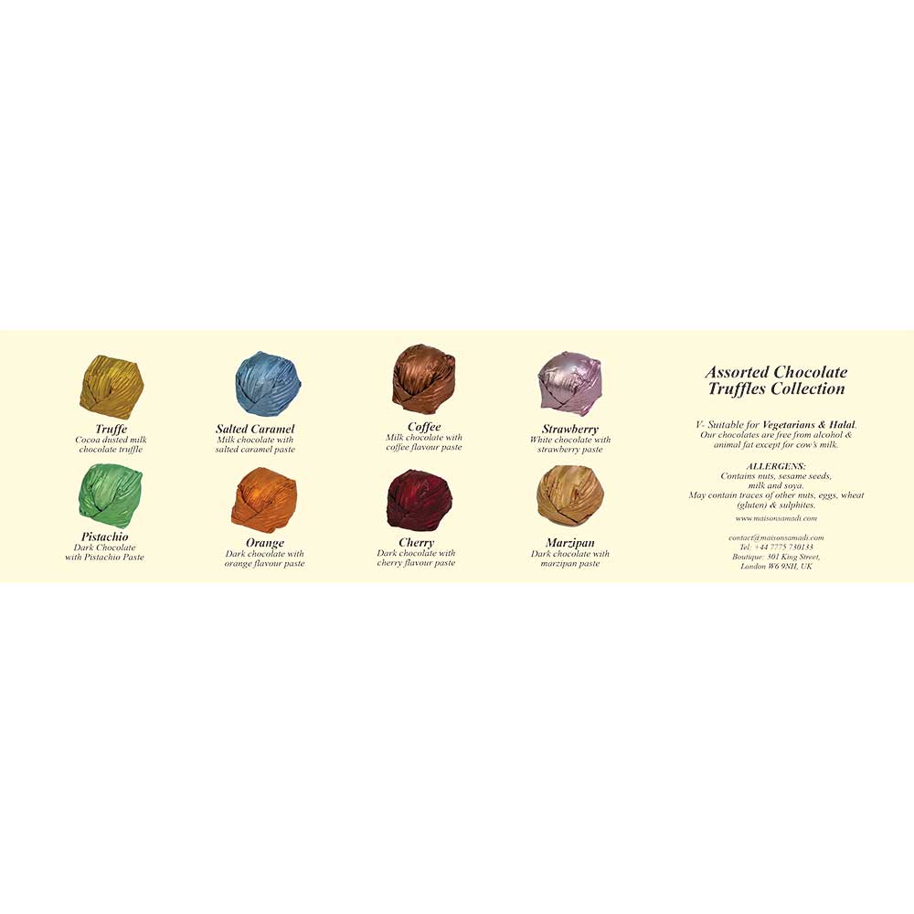 Ingredients: Sugar, Cocoa Mass, Cocoa Butter, MILK, Cocoa Powder, Coconut oil, Vanilla: Emulsifier (Vanilla SOYA lecithin), Salt, glucose, dextrose, butter ghee (MILK), palm oil, EGG albumin, citric acid, NUTS (ALMONDS, HAZELNUTS, PISTACHIO, WALNUTS), Natural flavours, natural food colours, Caramel, coffee, beta carotene (E150-E160), Natural Rose water blossom Cherry, Natural Orange blossom aroma, Natural Blackberry aroma, Natural Strawberry aroma, Potassium sorbate, pectin, Food Colour E100, E120, E129, E160, E171.