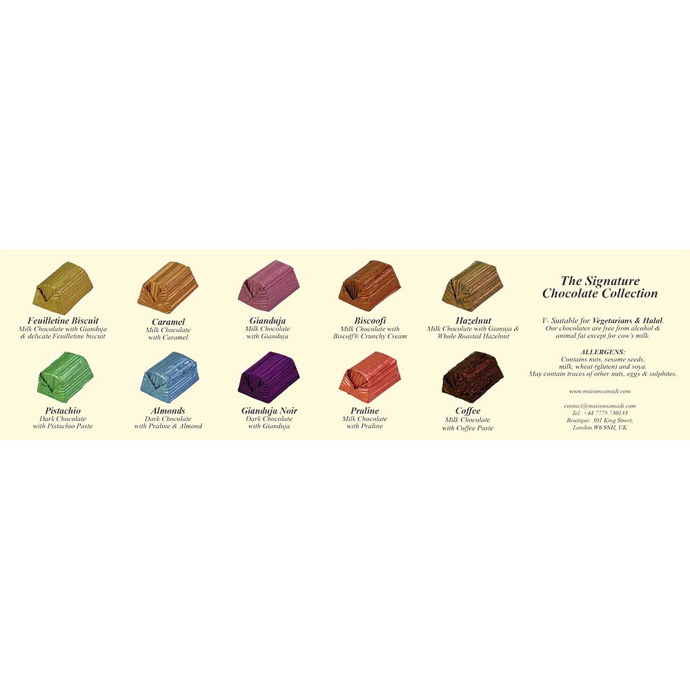 Ingredients: sugar, cocoa mass, cocoa butter, WHEAT powder, cow’s MILK, vegetable oils, vanilla ,SOYA, salt, dextrose, NUTS (including PISTACHIO, HAZELNUTS, WALNUTS, ALMONDS, PECAN, CASHEW, BRAZIL NUTS, PEANUTS) SESAME, WHEAT flour, corn starch, dried fruits (SULPHITES), natural fruit flavours(including blackberry, strawberry, blueberry, lemon), natural food colours, caramel, coffee, coconut.
